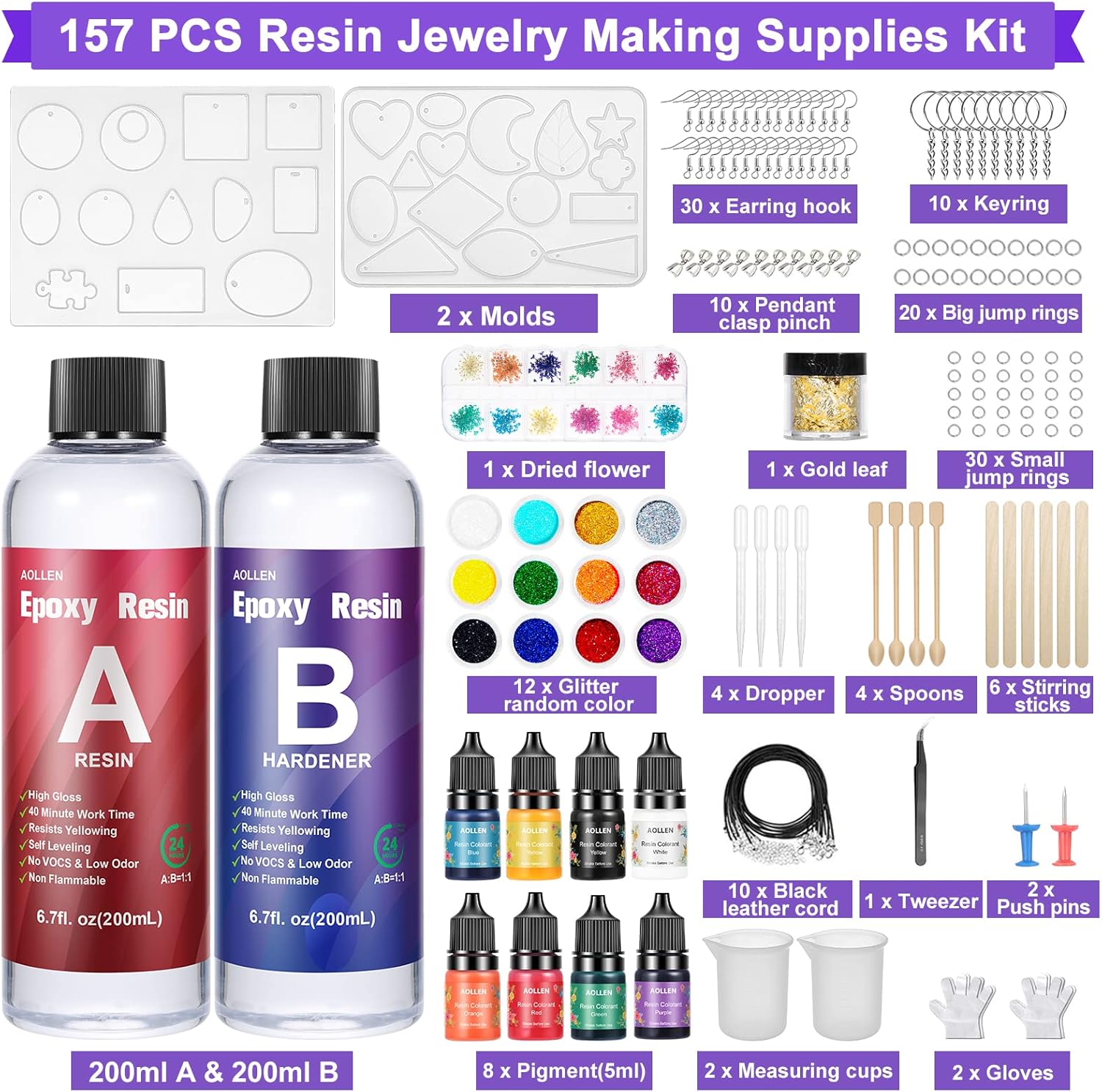 AOLLEN Epoxy Resin Kits for Beginners, 400ml Crystal Clear Resin Accessories with Moulds, Resin Pigment, Resin Glitter, Gold Leaf, Dried Flowers, Epoxy Resin Starter Kit for Jewelry Making