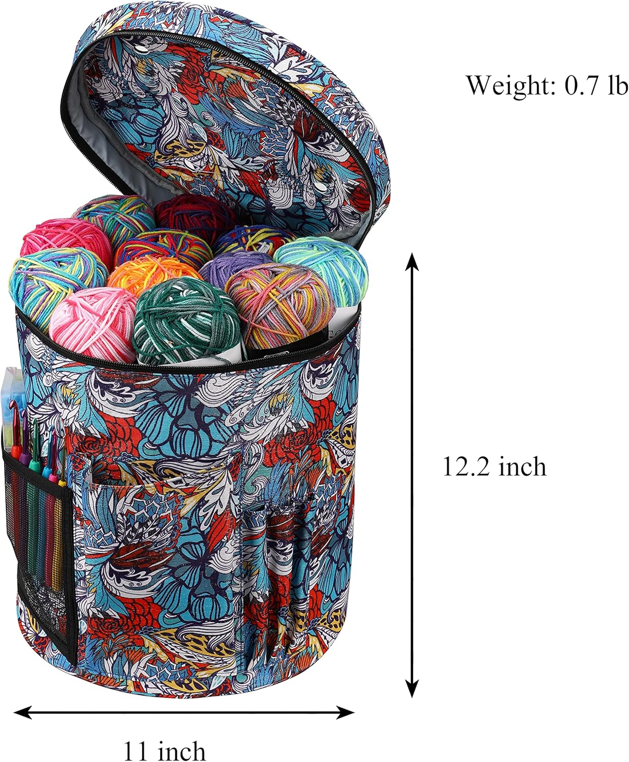 【LARGE VOLUME 】KOKNIT knitting bag yarn storage is large enough. 11″diameter X 12.2″high. The internal space can store 10-15 coils, and the outside pockets can be equipped with knitting needles, crochet hooks and crochet accessories